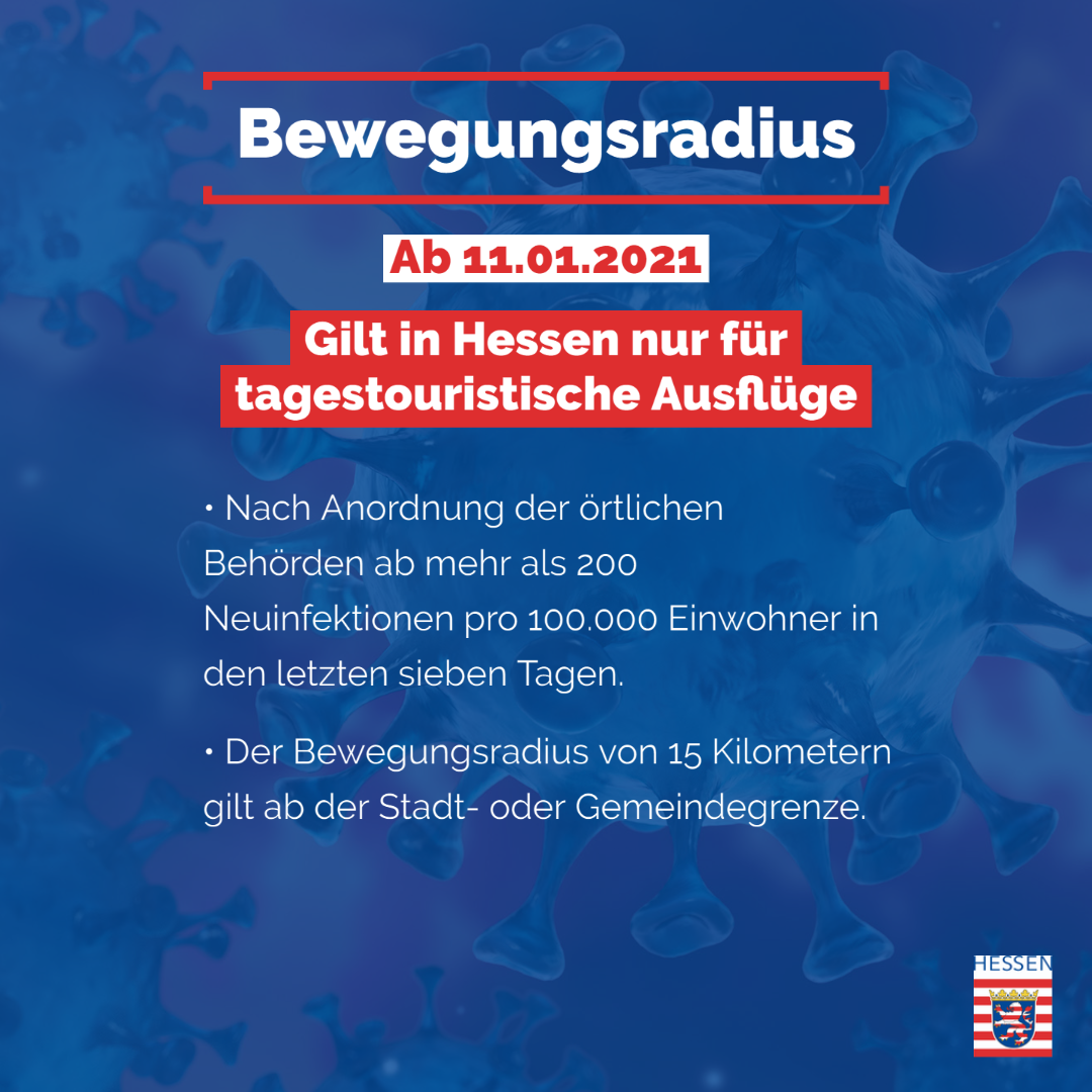 Wie die Hessische Landesregierung über Facebook mitteilte, gilt die Einschränkung des Bewegungsradius von 15 km ab der Stadt- oder Gemeindegrenze nach Anordnung der örtlichen Behörden ab mehr als 200 Neuinfektionen pro 100.000 Einwohnern in den letzten 7 Tagen nur für tagestouristische Ausflüge. Die Einzel- oder auch die Gesellschaftsjagd sind demnach von der möglichen Einschränkung des Bewegungsradius nach den Vorgaben der Landesregierung nicht betroffen.