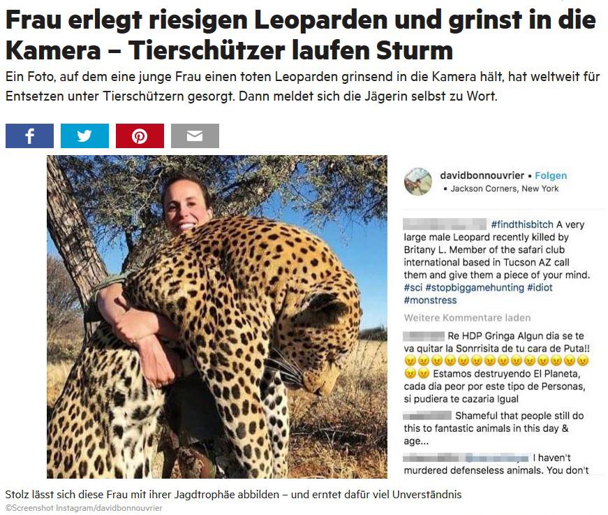 Das Bild zeigt eine junge Jägerin, die einen toten Leoparden hält: „Wut über Jagdtrophäe: Frau erlegt riesigen Leoparden und grinst in die Kamera – Tierschützer laufen Sturm“, titelt der STERN dazu. Das Bild hat die Jägerin nicht selbst auf Instagram eingestellt, es wurde von einem amerikanischen Tierrechtler gepostet. Mediale Aufmerksamkeit erzielt der Beitrag, seit Prominente wie das Modell Naomi Campbell das Bild in ihren persönlichen Netzwerken teilen. Zwischenzeitlich bedrohen Tierrechtler die Jägerin mit Hassmails, die zu Mord und Vergewaltigung aufrufen. Der Internationale Rat zur Erhaltung des Wildes und der Jagd (CIC) und der Deutsche Jagdverband betrachten diese Hetzjagd mit Sorge. „Ich finde es befremdlich, dass sich Teile unserer Gesellschaft aufgrund eines Fotos anmaßen, eine ausgewiesene Artenschützerin derart zu diskreditieren. Sie echauffieren sich über die regulierte Bejagung eines Wildtieres, dessen Management international gültigen Quoten und Kriterien folgt. Wir fordern eine faktenbasierte Berichterstattung“, so Dr. Wilhelm von Trott zu Solz, Leiter der deutschen Delegation des CIC.