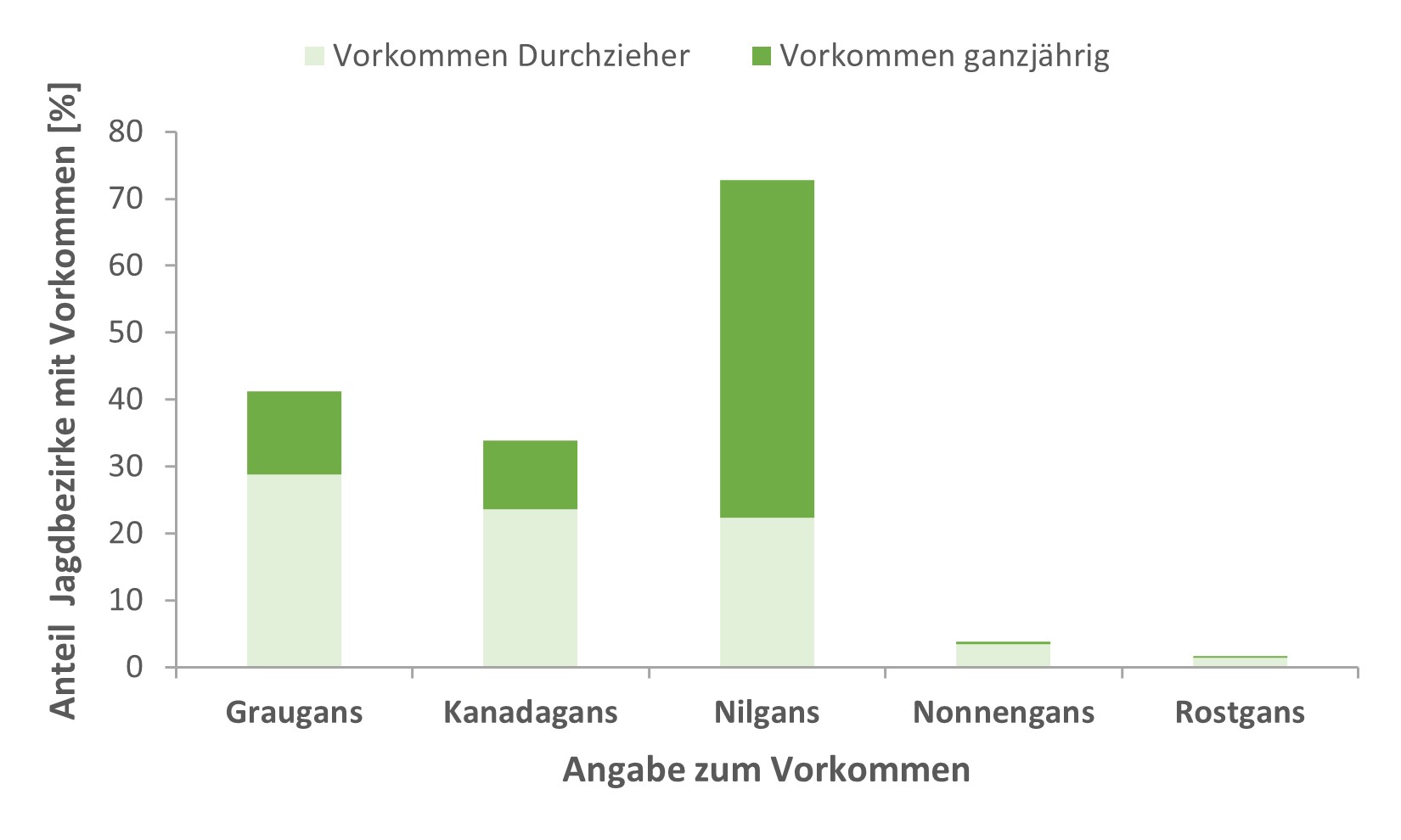 Ein Nilgansvorkommen wurde von 71 % aller teilnehmenden Jagdbezirke bestätigt. Während Grau- oder Kanadagans meistens nur temporär vorhanden sind (Durchzügler), ist die Nilgans in den meisten Jagdbezirken das ganz Jahr zu beobachten. Der Anteil an Jagdbezirken mit Brutvorkommen der Nilgans lag im Jagdjahr 2022/2023 bei rund 33 %.
