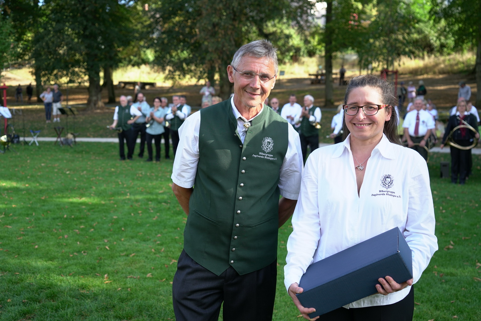 Der Bundes- und Landesbläserobmann Jürgen Keller moderierte das Bläserkonzert im Röthelbachtal bei herrlichem Sonnenschein.