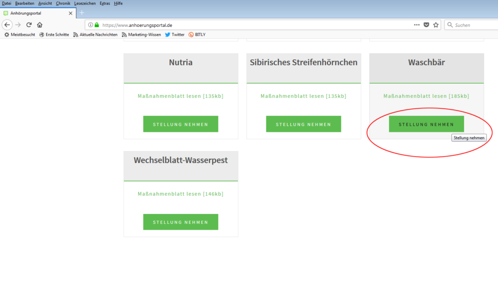 Liebe Jägerinnen und Jäger, die öffentliche Anhörung zu den Managementplänen u. a. für Waschbär und Nutria läuft noch bis zum 20. November 2017. Nutzen Sie die Chance und bringen Ihr Wissen und Ihre Argumente ein!