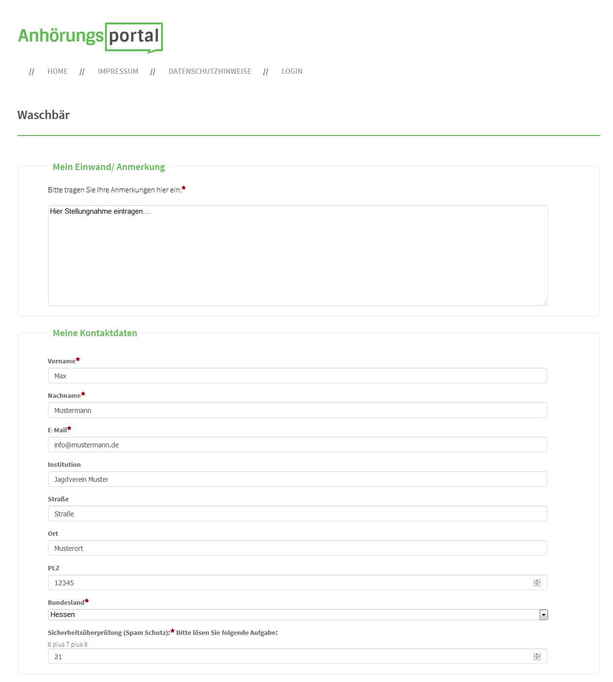 • Bitte geben Sie Ihren Namen, E-Mailadresse und Ihr Heimatbundesland an, damit die Einwendung zugeordnet werden und Sie ggf. nach der Beendigung der Anhörung über die Ergebnisse informiert werden. Anonyme Einwendungen können nicht berücksichtigt werden.