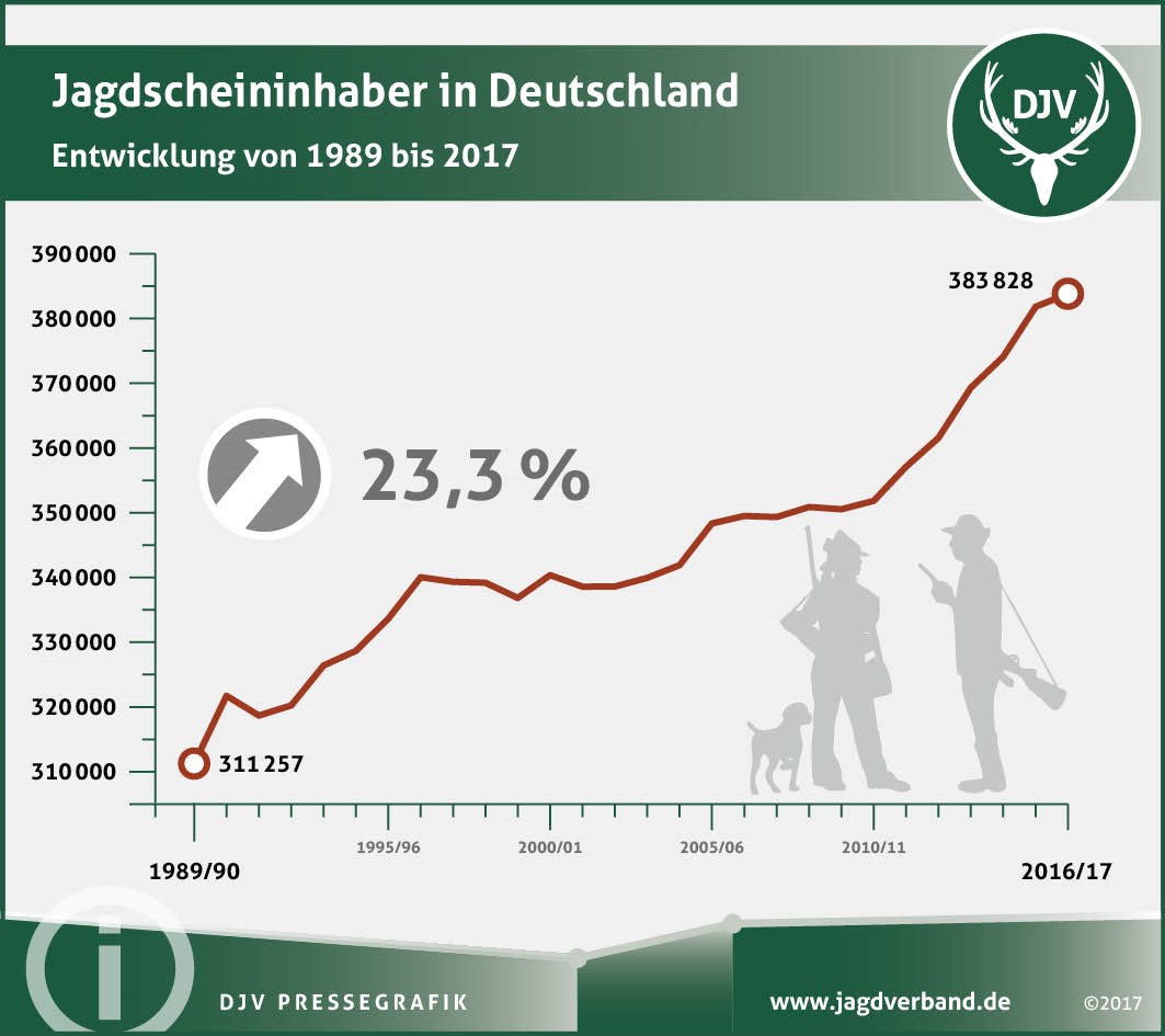 So viele wie nie zuvor: 383.828 Menschen in Deutschland besaßen im Jagdjahr 2016/17 (1. April bis 31. März) einen Jagdschein, 2.000 Personen mehr als noch 2015/16. Seit der Wiedervereinigung vor 27 Jahren gibt es nun über 72.500 Jägerinnen und Jäger mehr – ein Anstieg von knapp einem Viertel (23,3 Prozent). Die Bevölkerung wuchs im gleichen Zeitraum nur geringfügig. Den stärksten prozentualen Zuwachs gab es innerhalb des vergangenen Jagdjahres in Hamburg und in Mecklenburg-Vorpommern: Um jeweils über 7 Prozent stieg die Zahl der Jäger auf nun knapp 2.700 beziehungsweise rund 13.000. Diese und weitere Statistiken veröffentlicht der Dachverband der Jäger heute anlässlich der „Jagd und Hund“, Europas größter Jagdmesse.