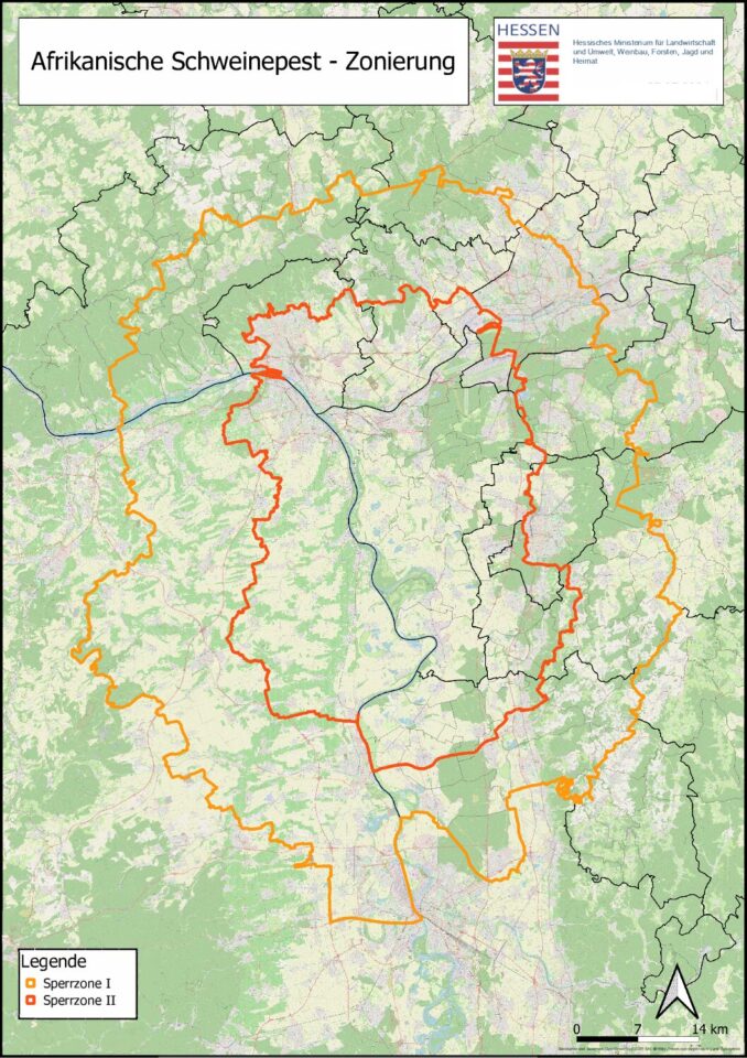 Im Zuge des Ausbruchs der Afrikanischen Schweinepest (ASP) in Hessen hat das Landwirtschaftsministerium die betroffenen Gebiete neu abgegrenzt. Die bisherige Restriktionszone von rund 100.000 Hektar soll in eine sogenannte Sperrzone II umgewandelt werden. Zusätzlich wird daran angrenzend ein zehn Kilometer breiter Streifen als eine neue Sperrzone I festgelegt. Diese umfasst knapp 150.000 Hektar und wirkt als sogenannte Pufferzone. Sie erweitert das betroffene Gebiet um Teile des Hochtaunus-Kreises, des Rheingau-Taunus-Kreises und weitere Gebiete des Kreises Bergstraße.
