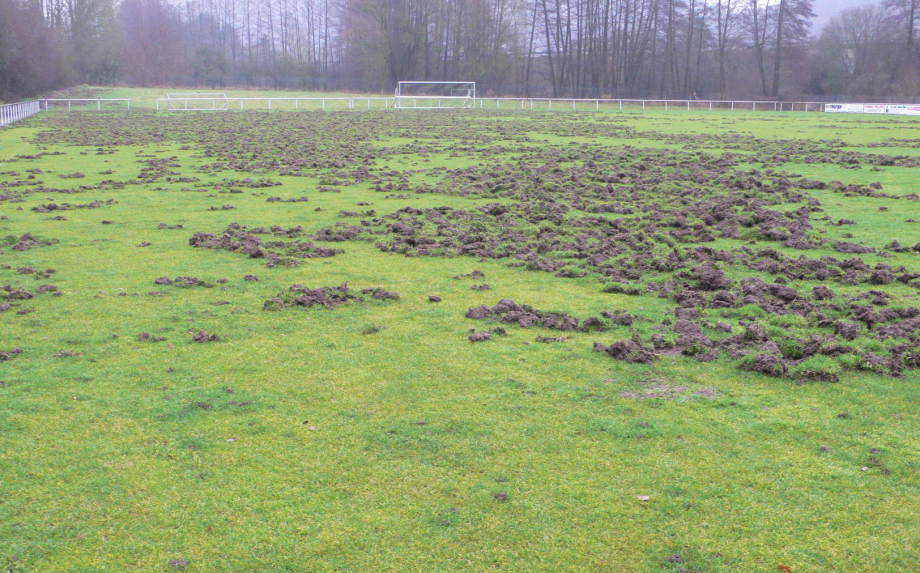 Am 3. Januar 2018 berichtete die Hessenschau über die verzweifelten Mitglieder des SCC Juno Burg. Seit Dezember haben sich die Schwarzkittel durch den Maschendrahtzaun gewühlt und auf dem Fußballplatz eine regelrechte Verwüstung hinterlassen.