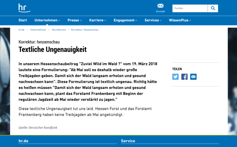 Die Hessenschau veröffentlichte am Montag, 19.03.2018 den Beitrag "Zuviel Wild im Wald?". Der Beitrag endete mit einem von der Autorin verfassten Text: "Ab Mai soll es deshalb wieder große Treibjagden geben".