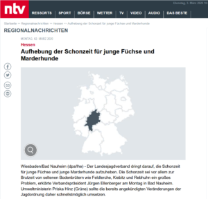„Derzeit können wir Ihnen noch nichts wirklich Neues zur Verordnung bezüglich der Schonzeiten für Jungfuchs und juvenilen Marderhund mitteilen. Momentan liegt die Verordnung zur rechtsförmlichen Prüfung im Hessischen Justizministerium, wir warten auf deren Rückmeldung. Daher können wir auch noch nicht genau abschätzen, wann die Verordnung im Staatsanzeiger veröffentlicht wird.“